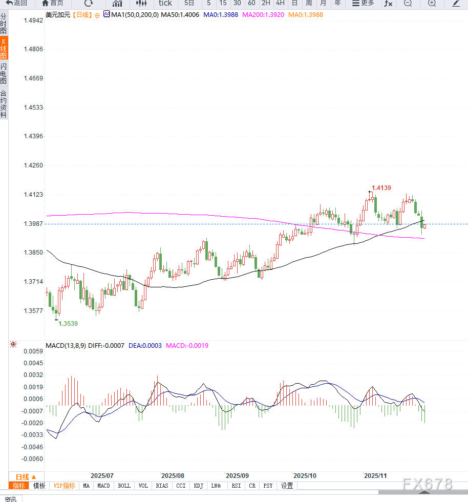 从日线级别结构来看,美元兑加元近期在1.3900上方企稳,呈现震荡反弹为主的节奏,但整体趋势仍偏向高位横盘。汇价多次在20日均线附近获得支撑,显示短线买盘活跃;