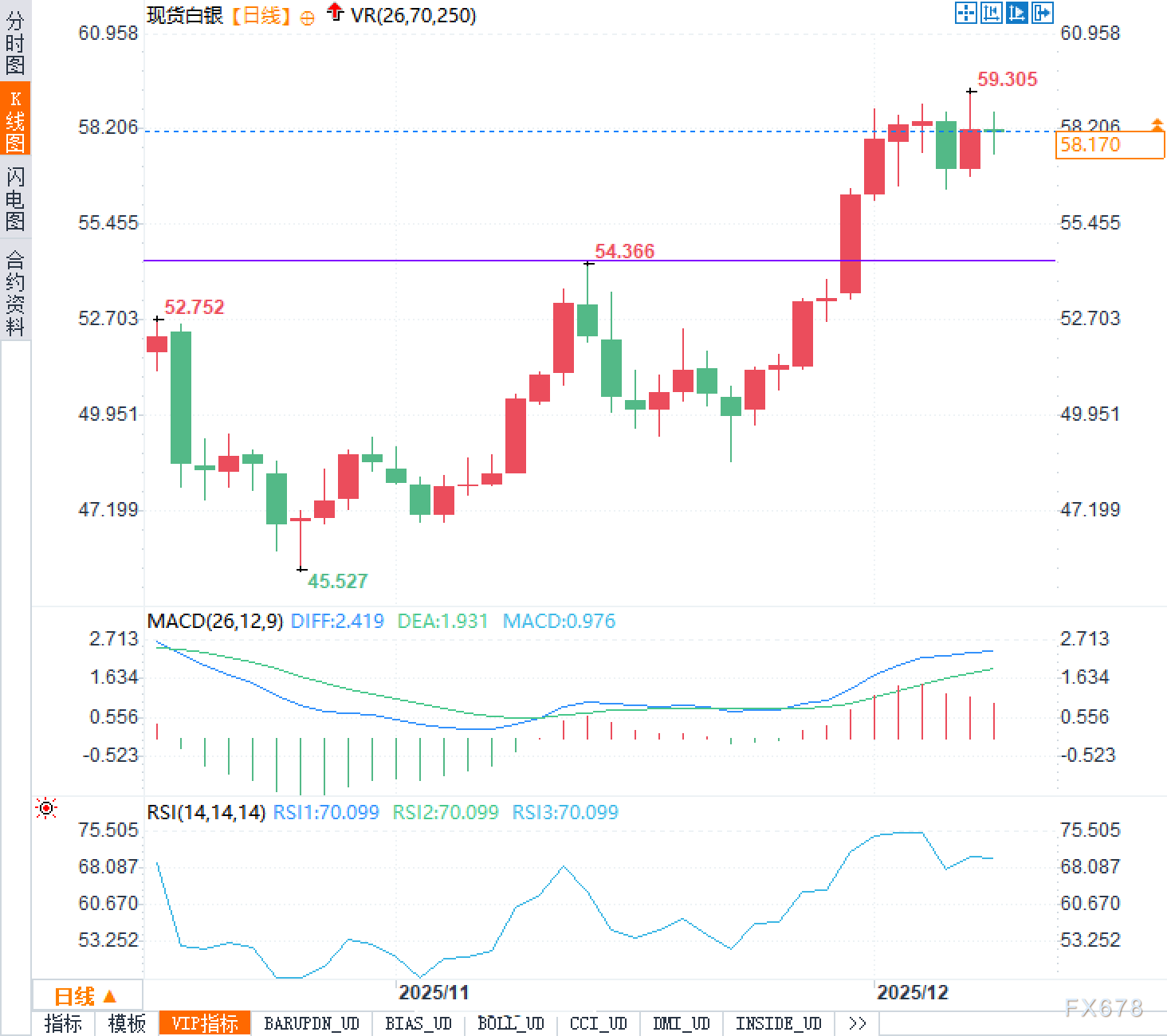 现货白银在过去5个交易日内基本运行于57至59美元区间之内,技术形态上呈现典型的横盘整理特征。COMEX白银期货非商业净多头寸较上周略有减少,表明大型机构交易员正在适度下调风险敞口,这与期权市场隐含波动率处于中性偏低区间的状况相互印证,共同指向短期方向选择尚未明朗。