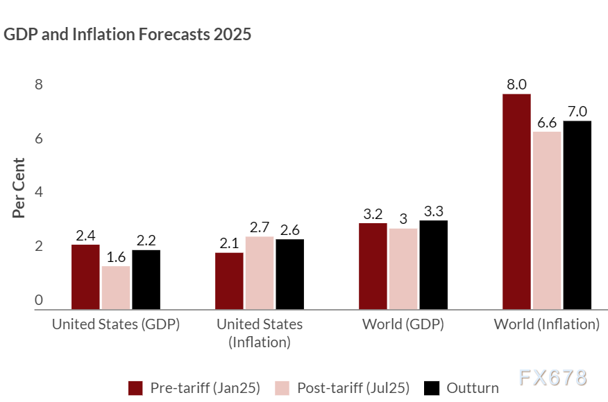 在通胀层面,关税生效后的预测数据显示,美国通胀率将升至2.7%,全球通胀率则降至6.6%,二者呈现出截然相反的走势。